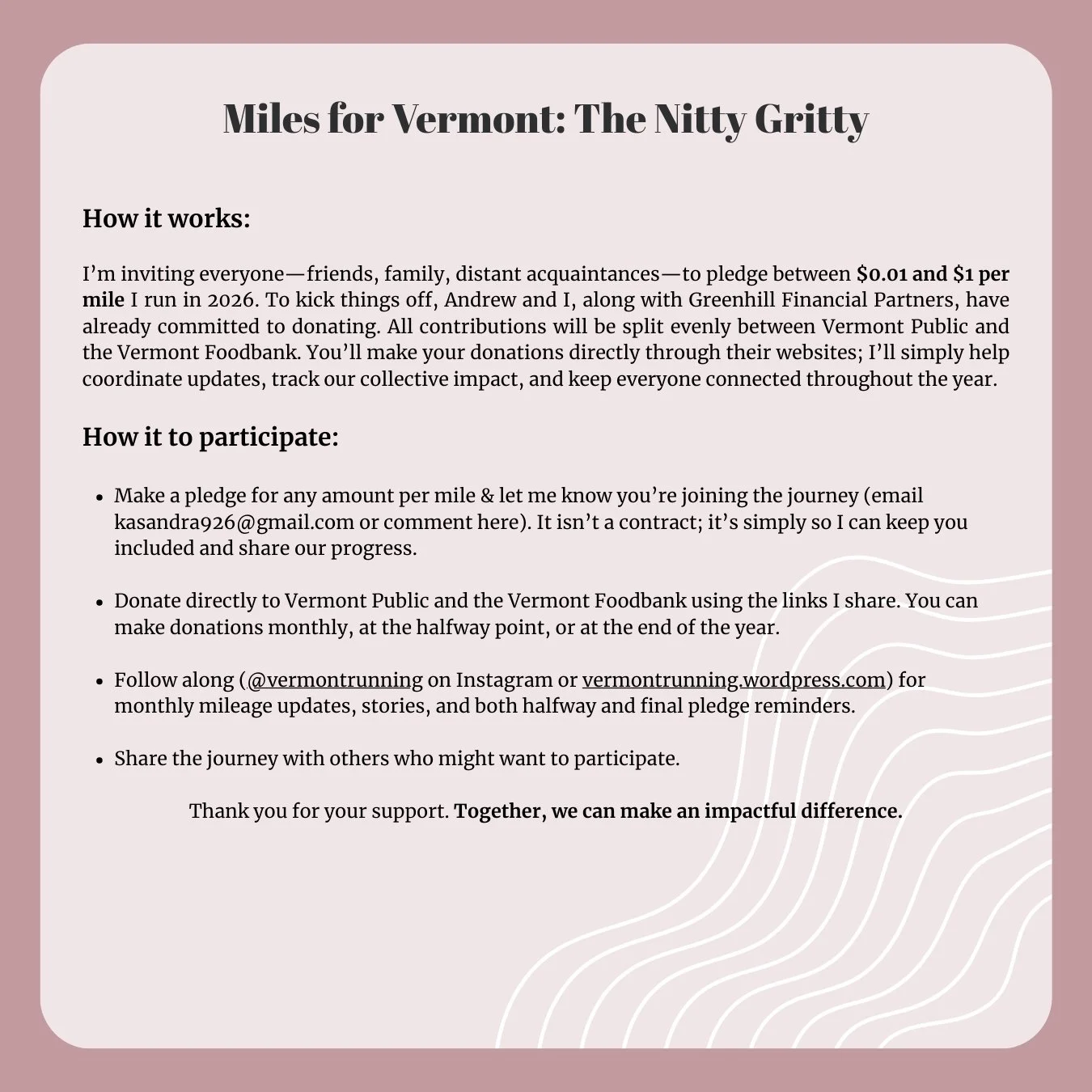 Miles for Vermont Community & Vermont Life Dec 2 Written By Kasandra Reid View fullsize View fullsize Miles for VermontCommunity givingVermont nonprofit supportCompassionate financial plannerFemale financial advisor VermontRunning for a causecommunity impact Kasandra Reid